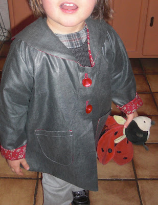 This little jacket is from the book 296 of the CJA ( just out in French Editions de Saxe ) but dubbed version made with a beautiful gray linen chintz ( that shines in the flash much more than in reality; France Duval-Stalla ) and this wonderful red Capel liberty that I loves so much ...